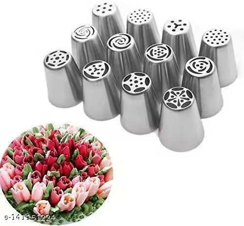 Name : AL ATASH 12 Pcs Russian Nozzles Set | Stainless Steel Reusable Decorating Nozzles Set | Russian Ruffle Skirt Icing Piping Tips | Cake Decorating Tool
