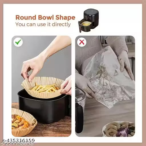 The air fryer paper sheets or air fryer parchment paper liners is made of food-grade parchment paper, which is oil proof, water proof and non-stick. Air fryer paper liners can withstand temperatures up to 428 degrees Fahrenheit and it has no effect on the taste of food.