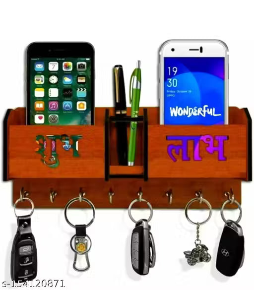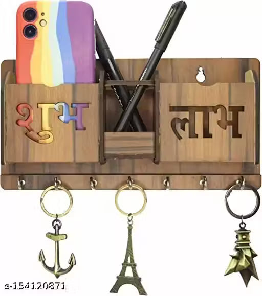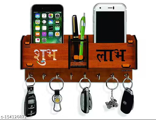 WOODEN KEY HOLDER -- Organise Your Keys, Wallets, Sunglasses and Masks, This beautifully crafted Key holder will catch eyes of your visitor, Perfect gift for House warming Its a perfect stand for Mobile charging.This perfect keys holder for home has 7 KEY HOOKS and Plenty of Room for keeping your things, This is a perfect wooden mobile wall holder for wall and a complete wall key holder for home décor . It has MULTI FUNCTIONAL USE like you can hang your mask, Keep your mobile, ID Card and the pocket of the key holder is perfect mobile stand for wall : Could be used to hang jewellery or other fashion accessories. MOBILE HOLDER is a ideal house warming gift . The keychain holder is made of MDF and is a perfect Wooden key holder for wall and a complete keyholder wall decor stylish . KEY HOLDER for home wall stylish can be used in office, entryway as well. Key stand key hangers for wall stylish and key stand for wall stylish wood key holder for home decor stylish.