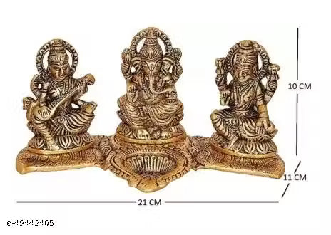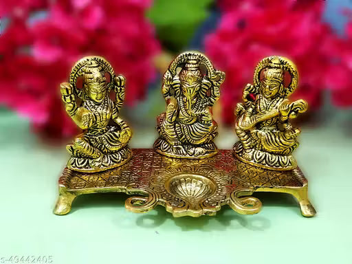 Metal Golden Finish Laxmi Ganesh Saraswati. Laxmi Ganesh Saraswati is gold plated with antique finish so looks very beautiful and use for the purpose of worship and for home decorative. It's design to looks traditional stylish and inspiration from the day's of royal touch.