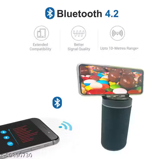 In Bulid Mobile Stand, So u can Play Audio on this device and watch video handsfree Also Have FM Mode and USb Card Sloat And PenDrive sloat. Super Beautiful Multi Color LED Light Ring Around the Speaker Long Battery Life 6 Hours Continues Music Time. Bluetooth 5.0 Technology : Equipped with advanced technology and compatible with all bluetooth compacity devices. Speaker would automatically reconnect to the last device used. High Bass Sound Quality.