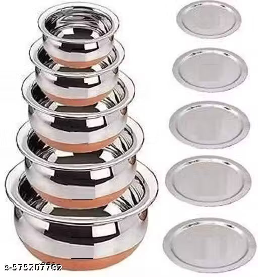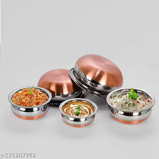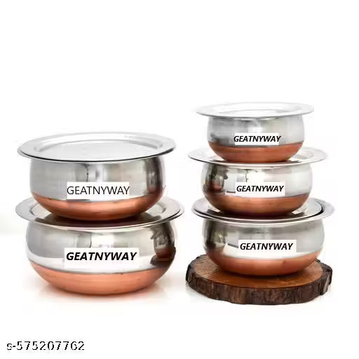 Name : Stainless Steel Copper Handi (5-piec) with Lid |Serving Bowls Handi | Bottom Copper Handi Set with Lid (1500ml, 1100ml, 800ml, 600ml, 400ml)