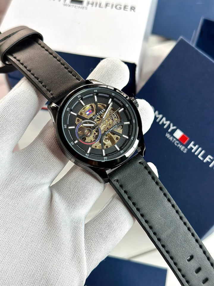 Tommy Hilfiger Men's Automatic Skeleton Dial Watch – Leather Strap, Luxury Gift Edition